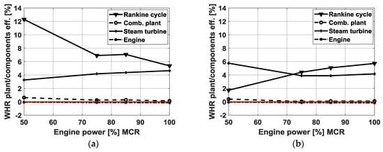 WHR plant and component-efficiency comparison versus engine load with an engine using (a) NG or (b) HFO.