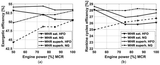 Using HFO as engine fuel, Figure 12a shows that exergetic efficiency tendentially increased with decreasing engine power for both the saturated- and the superheated-steam plant. The variation of Rankine cycle efficiency was different with decreasing engine power. As shown in Figure 12b, a slight decrease of efficiency with decreasing engine power from 100% to 75% was followed by an increase when engine load decreased from 75% to 50%.