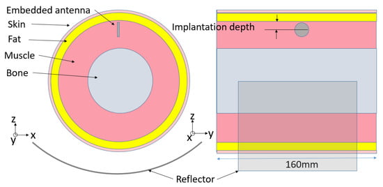 A metallic wave reflector is placed behind the human tissue model in order to enhance the implanted antenna’s power reception. The half-cylindrical reflector (open angle = 180°, thickness = 1.2 mm) is placed behind skin surface (see Figure 1) at the opposite to the patch antenna side. Reflector is made of copper and has a thickness larger than the penetration depth. It is cylindrical and the radius is chosen according to the following formula: