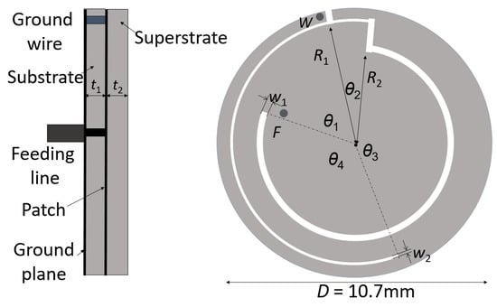 The embedded antenna with all relative parameters are presented in Figure 2. The antenna has a circular substrate (thickness = 0.64mm) and a superstrate of the same size and thickness, which are all made of material Rogers RO3210 (εr = 10.2, tanδ = 0.003). A radiating patch situates between the two layers. Two arctic slots are cut from the metallic patch for the appearance of the two resonant frequencies (400 MHz at MedRadio band and 915 MHz at ISM band respectively). A ground plane positions below the substrate and is connected with the radiating patch by a via (radius = 0.15 mm) at point W for miniaturization. A coaxial cable standardized to 50 Ω is used for feeding the antenna at point F. All the necessary parameters are marked in Figure 2 and detailed in Table 2. Due to multiple standards on the transmission power limit [21,22], this wireless power transmission system operates at the ISM bands (902.8–928 MHz) and the antenna is used for receiving power from another outside antenna at this frequency.