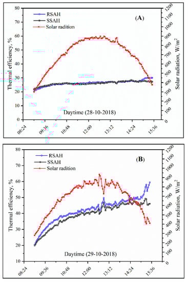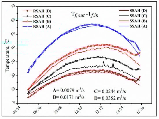3.1. Variation of Solar Radiation, Ambient Temperature, SAHs Air Outlet, and Inlet Temperature Differences for Roughened and Smooth Solar Air Heaters, Respectively