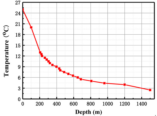 This paper used the Lingshui 17-2 gas field project in the South China Sea as a case for installation research. According to the actual sea conditions, the density of the seawater is 1.025 × 103 kg/m3, and the kinematic viscosity coefficient is 1.35 × 10−6 m2/s, while the temperature is shown in Figure 4. The current parameters are shown in Table 1, and the wave parameters are shown in Table 2.