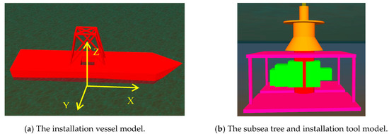 Given the conditions of the South China Sea Lingshui 17-2 area, Offshore Oil 708 was selected as the installation vessel. The parameters of Offshore Oil 708 are shown in Table 3, the physical parameters of the subsea tree and the installation tool are shown in Table 4, while the subsea tree and the installation tool material parameters are shown in Table 5. In the OrcaFlex software, the 6D buoy model was used to model the subsea tree and its installation tool. Based on geometric similarity and kinematic similarity, the subsea tree was simplified, while the overall structure of the tree remained unchanged. Masses such as pipes and joints were assigned to the body of the tree, ensuring that the center of gravity of the simplified model remained unchanged. The structures of components such as the tree valve and tree frame were modeled with an elastic solid, and the installation tool was connected to the subsea tree. Figure 5 shows the 3D model of the installation vessel, the subsea tree and installation tool generated with the OrcaFlex software.