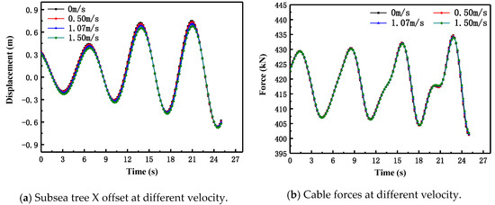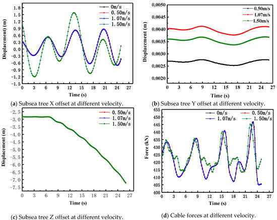 When passing through the splash zone, the wave velocity and period under normal weather conditions were considered as invariant, which in this case denoted a wave height of 1.5 m and a period of 7 s, while the velocity was taken as 0 m/s, 0.50 m/s, 1.07 m/s, and 1.50 m/s. Then, the horizontal X offset, Y offset, vertical Z offset, and the cable stress of the subsea tree were analyzed. The simulation analysis results are shown in Figure 6.