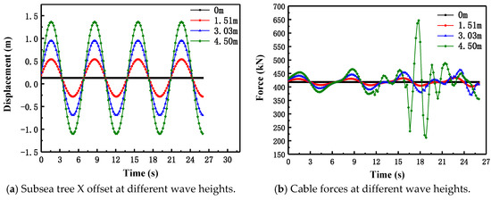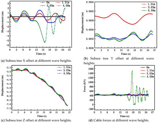 When passing through the splash zone, the wave velocity and period under normal weather conditions were considered invariant, which in this case denoted a velocity is 0.50 m/s and a period of 7 s. The wave heights were taken as 0 m, 1.51 m, 3.03 m, and 4.50 m, while the lateral X offset and cable stress of the subsea tree were analyzed. The simulation analysis results are shown in Figure 8.