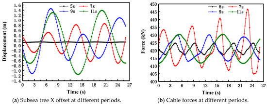 When passing through the splash zone, the flow velocity and wave height were considered invariant, and in this case, the velocity was 0.50 m/s and the wave height was 1.5 m. Periods of 5 s, 7 s, 9 s, and 11 s were obtained to analyze the lateral X offset and cable stress of the tree. Figure 10 shows the simulation analysis results.