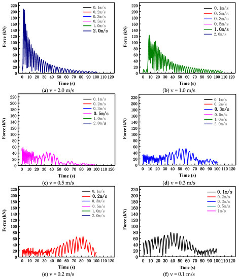 According to the sea condition parameters, the flow velocity was 0.50 m/s, the period was 7 s, and the wave height was 1.5 m. Based on past experience, the lowest possible speed was selected for lowering the installation. The absolute lowering speeds of 0.1 m/s, 0.2 m/s, 0.3 m/s, 0.5 m/s, 1 m/s, and 2.0 m/s were used for the simulation calculations, while the force of the tree under different lowering speeds was studied. A force diagram of the tree is shown in Figure 11. The external force was the highest at a 2 m/s lowering speed, followed by a 1 m/s lowering speed. The other speeds had no significant impact on the force of the tree.