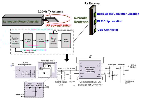 Figure 3 illustrates a block diagram of the proposed RF EH system [8]. It comprises a 2 × 3 array patch antenna, 6-parallel RF-DC converter in the front side, DC-DC converter, BLE module, and Universal Serial Bus (USB) connector on the back side of the Rx module PCB board. The front view of the PCB has a rectenna composed of five RF-DC converters and five patch antennas; one RF-DC converter and one patch antenna are configured for the pilot signal only. The proposed RF-DC converter of each rectenna is fabricated based on a Dickson charge pump structure. A six-array rectenna with two Schottky diodes was adopted to produce high efficiency and high-output DC voltage. It has an optimized third harmonic source termination for an improved conversion efficiency, and the implemented RF-DC converter includes series transmission lines and open-stubs for the third harmonic inductive termination and fundamental impedance matching. The simulated third harmonic contour using the harmonic source-pull simulation shows an optimum region near jX75 Ω with a maximum efficiency of 69.45%. The optimum third harmonic impedance is inductive due to the junction capacitance of the Schottky diodes, and the input capacitance and inductive source impedance produce parallel resonance for an appropriate Class-F third harmonic termination. Compared to the efficiency of the rectifier without harmonic control, the proposed rectifier with harmonic control exhibits a 5.2% higher efficiency at an input power of about +20 dBm. Using the optimum third harmonic termination, the voltage waveforms across the Schottky diodes of RF-DC converters become closer to the square waves of an ideal RF-DC converter. The rectenna is the first block at the input of the Rx module to rectify the RF signal. A combining capacitor at the output of the rectenna is also used as a low-pass filter to remove ripples at the output. The output of the rectenna is fed to the buck-boost converter. In order to eliminate voltage variation, a buck-boost converter is used to produce constant output voltage. When the input voltage level reduces due to the weak RF signals, the boosting operation of the buck-boost converter is performed to maintain the output voltage level and vice-versa. A low drop-out (LDO) regulator can be used to maintain a constant output voltage. A super capacitor is connected at the output of the buck-boost converter to store energy and provides power for IoT/wearable devices and charging the battery.