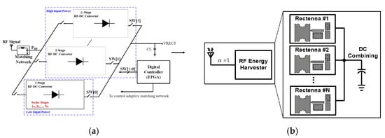 The proposed NEH (Number of rectenna circuits) multiple rectenna basic structure is depicted in Figure 4. The RF-DC circuits can be implemented in parallel and series to maximize the efficiency of the system. The RF-DC circuits in this work are implemented in parallel and are followed by a DC combiner capacitor to limit the complexity of the system. The nonlinear EH is reconfigured adaptively based on the received signal power and is controlled by FPGA. An identical nonlinear EH model for each rectenna, especially the RF-DC circuit, is assumed [11,12,13]. Hence, the harvested power of the ith rectenna circuit, denoted by PEH,i, is expressed as