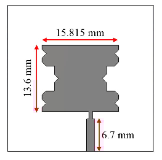 The antenna takes the RF signal (5.2 GHz) from the Tx power amplifier and feeds it to the EH system and memory cell. A Koch fractal patch antenna with high reflection co-efficiency and gain and an inter-element spacing equal to 0.5λ (at the design frequency of 5.2 GHz, λ is the wavelength in free space) as a compact size for the Rx module side is implemented as shown in Figure 6.