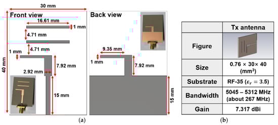 Figure 7a,b illustrate a 5.2 GHz Quasi-Yagi antenna configuration on the substrate of Taconic RF-35 (0.76 mm) to transmit a total power of 3 W, being used as a wireless power transmitter and its specification.