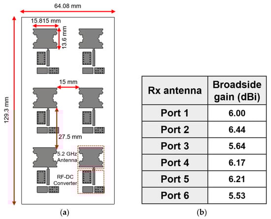 An Rx module designed by a 2 × 3 array antenna is located at a distance up to around 1 m (the distance can vary to harvest more RF input power) from the transmitter to harvest the transmitted power as shown in Figure 8a. The broadside gain of each port Rx antenna is shown in Figure 8b.