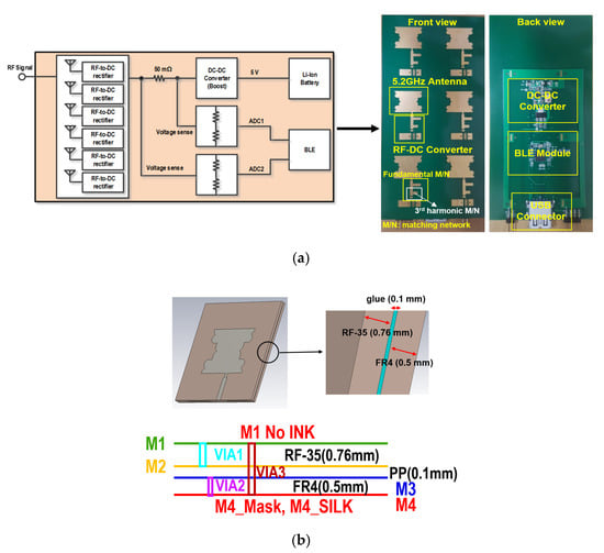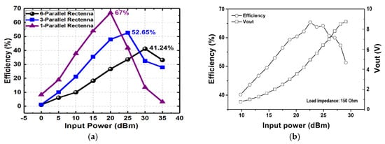 The module of the proposed RF EH including reconfigurable scheme and third harmonic control with the information of the PCB layers is shown in Figure 9a,b. The 6-parallel rectenna shows 67% conversion efficiency and higher than 6.1 V output DC voltage at the input power level of +20 dBm. 4% improvement in efficiency is achieved in compared with the case without the third harmonic control circuit and efficiency.