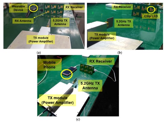 Test environment of the proposed RF EH (a) The Rx receiver board is connected to a G watch, (b) Chip LED, and (c) Mobile phone. Reprint with permission [4775431338148]; 2020, IEEE.