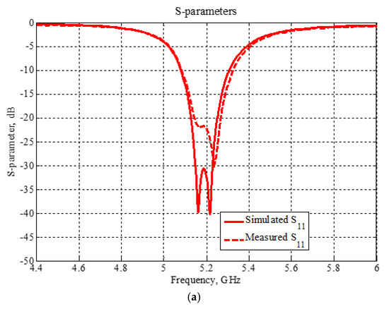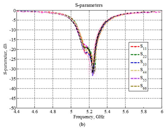 Reflection coefficient of (a) the Tx antenna and (b) 2 × 3 Rx antenna.