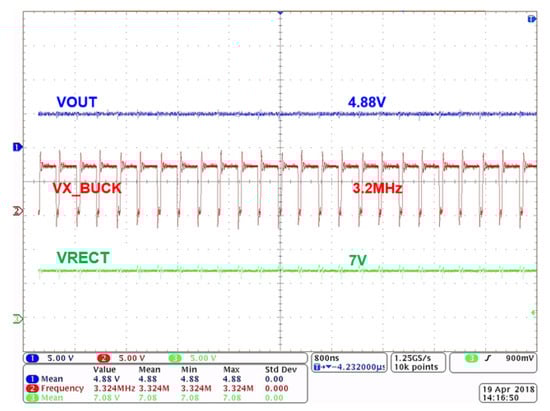 The simulation result of the buck-boost converter is illustrated in Figure 13. The maximum efficiency of the buck-boost converter reaches 93% at 2 MHz switching frequency. The measured functional performance of the RF EH harvester system is illustrated in Figure 14. Table 2 lists the important metrics of the RF RH system including key features, elements used in the Rx module, and PCB boards. Table 3 summaries the whole performance of the RF EH. During the measurement, the USB connector is connected to IoT/wearable devices such as a G watch, LED, and cell phone.