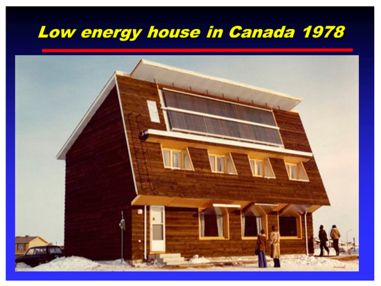 Saskatchewan Energy Conservation house designed by the Illinois U demonstrated passive technology in 1978 (Regina). Solar exposed surface with large windows is slightly inclined. Evacuated solar pipes are placed on the attics level. It was provided with air-sourced heat pump and polyethylene-based heat recovery ventilator. Reprinted with permission of Harold Orr.