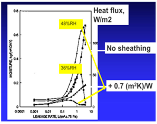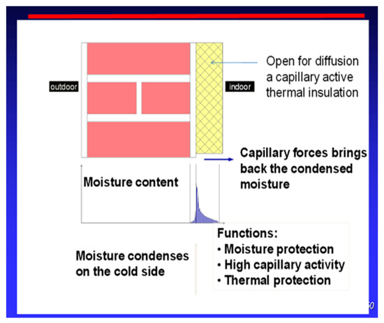 So, when the wall acts as a ventilated heat exchanger, covering the wall surface with capillary active materials can create a new method for moisture management. The air gap is contained between a capillary active layer on the exterior side, and interior thermal insulation is provided with a water-vapor retarder. In cold climates, in the winter, the interior relative humidity is typically below 50%, so air passing through a major part of the wall height will slowly remove moisture from the old wall after the retrofit has been completed. At the same time, the capillary-active layer is designed so that it enables the transport of moisture from the existing wall to the ventilated space [24].