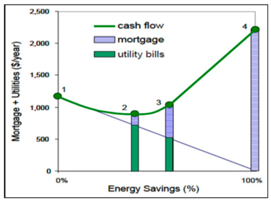 Figure 6 shows that the integrated design process (IDP) invariably starts with lowering utility bills without cost increase and that all passive measures create only a small increase in the ownership cost that is here expressed as mortgage [30]. With increased use of these measures, the ownership cost (mortgage cost plus utilities) passes through a minimum. There is another characteristic point on the curve shown in Figure 6, namely a point of equilibrium in which the use of photovoltaic (PV) panels is the same as traditional passive measures.