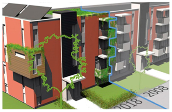 Figure 7 shows the application of a multi-stage construction process in a building cluster called “Atelier Rosemount” in Montreal [32], that included a mix of different types, e.g., social or ecological dwellings. Initial construction began in 2008 and stepwise upgraded until reaching 92% of the cumulative reduction 10 years later. The retrofitting included the following steps: