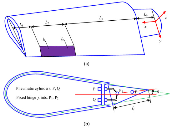 In Figure 1b, P and Q are two pneumatic cylinders located in position l1 in Figure 1a. Two piston rods of the two cylinders are connected to the fixed joint P2 (in the rigid trailing-edged flap) through two connecting rods. P1 is another hinge point, which is connected to the host structure of the blade through a shaft. The position point P1 is above the midline of the blade section with slight deviation so that the swing angle of trailing-edge flap is within the range of –15 to 18 degrees. When the two piston rods synchronously move, in reverse, the trailing-edge flap structure can deflect. Note that the other two cylinders with the same function are installed in position l2.