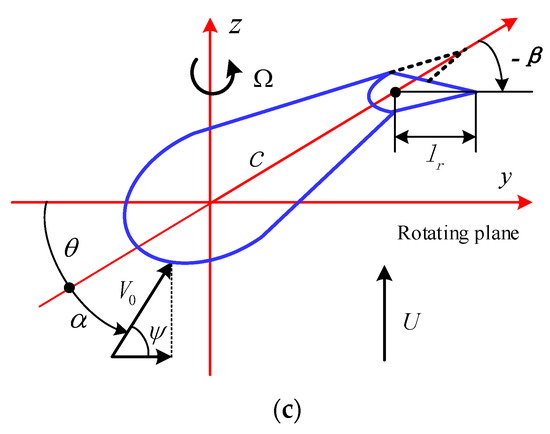 It should be stated that the expressions of aerodynamic force and moment are a novel set of quasi-steady-state hydrodynamic equations, which are suitable for the analysis of the rigid trailing-edge flap behavior of the rotating blade. In particular, for the length lr of the trailing-edge flap in the spanwise direction, it is exactly a specified value lr = c/6. In addition, the expressions of Lift and Moment in Equations (3) and (4) are only used for the aerodynamic calculation of the trailing-edge flap structure, while the Beddoes–Leishman model based on fitted aerodynamic coefficients [23] is used to calculate the stall-induced aerodynamics of the other structural parts along the spanwise direction in this study.