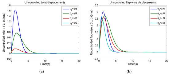 The uncontrolled twist/flap-wise displacements under conditions of ply angles , respectively: (a) The uncontrolled twist displacement; (b) The uncontrolled flap-wise displacement.