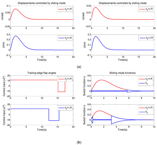 The controlled displacements and control signals: (a) The controlled displacements under conditions of ply angles with , respectively; (b) The control inputs (trailing-edge flap angles) and sliding mode functions.