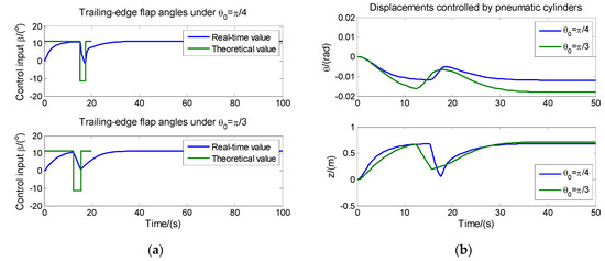 The real-time tracking of trailing-edge flap angles and the real-time diaplacements controlled by pneumatic cylinders under conditions of , respectively: (a) The real-time tracking of trailing-edge flap angles; (b) The real-time diaplacements controlled by pneumatic cylinders.