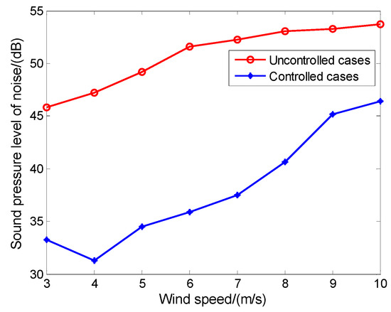 There are other beneficial effects, such as noise control. The aerodynamic noise is caused by the motion of the impeller and the air when the turbine is rotating normally, which produces pressure reactions and swirls to the air. An aerodynamic noise test was performed on a wind turbine with a rated power of 50 kW (which here refers to the case without a trailing-edged flap), compared to the test result after the trailing-edged flap was added. The sound sensor is placed in the center of the hub, and Figure 7 shows the noise contrast results measured by the sensor. It can be seen that with the increase of wind speed, the noise in both cases shows an increasing trend, but under the controlled cases using TFC, the noise level decreases obviously compared with the uncontrolled cases without a trailing-edge flap structure. As the wind speed increases, the distribution of the two kinds of noise appears to be close, which may be due to the increase of the mechanical noise brought by the control process of TFC, which affects the measurement results.