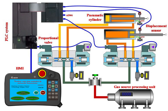 Owing to the large wind power system being mostly controlled by PLC hardware, some intelligent control algorithms cannot be implemented in PLC hardware because of their complexity. For the purpose of engineering application, it is necessary to discuss the physical application of SMC/ARL and ASMC/MPLNN algorithms in Programmable Logic Controller (PLC) hardware and further confirm the physical effect of real-time control driven by pneumatic transmission. Figure 8 shows the experimental platform used for project implementation, with only the pneumatic unit at position l1 illustrated. The platform consists of Siemens PLC controller hardware system and the execution unit of pneumatic driving. The PLC system is composed of a CPU module, an analog module, a Human Machine Interface (HMI), and displacement sensors. The pneumatic execution unit in position of l1 is composed of a gas source processing unit, two proportional valves, a pneumatic pipeline system, pneumatic cylinders, and other accessory valve structures. The implementation scheme of the project is as follows:
