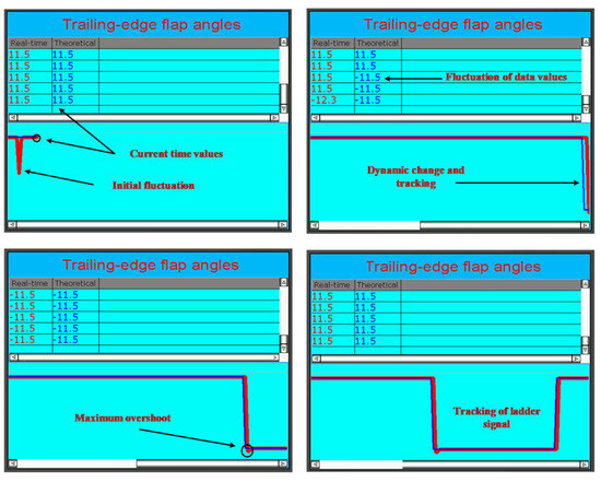 Still, take the previous case for real-time tracking of trailing-edge flap angles under condition of in Figure 5a for example; Figure 9 shows the HMI interface and the physical displacements of piston rods detected by the sensor after the gain conversion in HMI, which represents the actual trailing-edge flap angles. The transverse coordinates in Figure 8 are time coordinates. Figure 9 shows only four frames of dynamic change of the trailing-edge flap angles with the change of time.