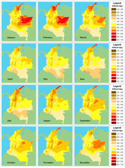 Figure 1 shows the monthly solar resource maps of the country. According to [], these maps were calculated using the measurements at the ground level of 71 weather stations over the country and correlated with the information of brightness, relative humidity, and temperature measurements of other 383 additional stations [].
