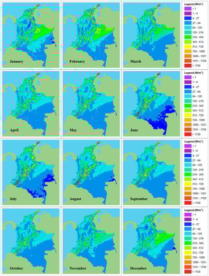 From Figure 1, it can be seen that in the months of December to April, the best solar potential is located from the center to the northern regions, with values above 4.0 kWh/m2 in almost all the country. Likewise, it can be seen that from the months of May to August the solar potential is reduced, but there is still a good capture of solar radiation in the regions near to the oceans, especially in regions close to the Caribbean Sea. Finally, there is more solar potential in the northern region of the country from September to November, while in the western region the solar potential is reduced. Throughout the year, the best months in terms of solar resource are January and February and the worst are May and June. Please note that the capture of solar energy in some regions of the country is adequate for the installation of solar power systems [].