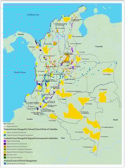 Protected natural areas are a common way of conserving the natural resources in developing countries. The formal establishment and enforcement of protected areas in Colombia dates back to 1994 when the Colombian government signed the agreement on Biological Diversity in which Colombia committed to establish and maintain terrestrial zones and marine systems that are fully protected, managed, and ecologically representative, as well as to contribute to the achievement of the conservation objectives defined in the agreement []. After that, Law 165 was enacted [], based on which the National Biodiversity Policy was formulated, and a commitment was made to create and strengthen the SINAP (National System of Protected Areas).