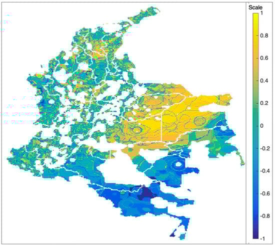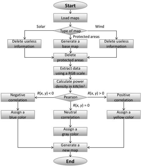 Finally, a new scale of colors based on the values obtained from Equation (1) is defined. Then, the values stored in the results matrix are converted into a new image that has the same characteristics of the resources maps. The negative of the Pearson coefficient is used to match the colors of the defined scale. A yellow-based color is assigned if a positive value is obtained, meaning a good correlation between the data of that pixel; a negative value means a bad correlation, and a blue-based color is assigned. A neutral correlation is obtained when the negative of the Pearson coefficient has a value of zero and a gray-based color is assigned. Using this information, new maps showing the energetic complementarity between both resources are generated for each month.