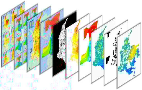 Figure 5 shows the sequence in the processing of the natural resources maps to obtain the monthly energetic complementarity maps using image processing techniques and the proposed procedure. From this figure, it can be seen how the natural resources maps are processed and the useful information for the study is extracted until a new energetic complementarity map is obtained.