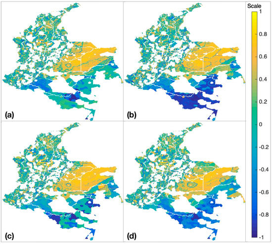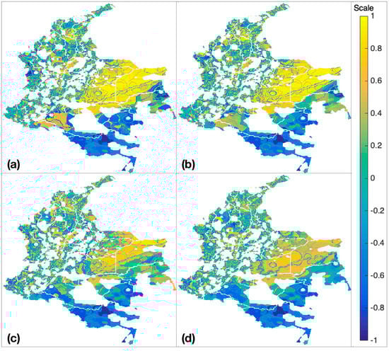 Figure 7 shows the energetic complementarity obtained for the months of May, June, July, and August. Note that the energetic complementarity for these months is good in almost the same regions of the previous ones but with a reduced value. Furthermore, there are fewer regions in blue color, particularly in May (see Figure 7a) and in July (see Figure 7c). The reason is that the solar resource is available in almost the entire country during these months, as shown in Figure 1, and there is also a good wind resource, as shown in Figure 2. June is the month with the lowest value of the negative Pearson correlation coefficient obtained in the south with values close to minus one, as observed from Figure 7b. Figure 7d shows that in August there is a good energetic complementarity in the regions where the Colombian Andes pass because there is good wind potential, but unfortunately, many of these places are difficult to access and the land is not suitable for the installation of generation systems.