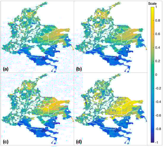 Figure 6a shows the energetic complementarity obtained for January. It can be observed that there is a higher complementarity in the northeastern region of the country. Moreover, there is a good complementarity in some regions of the center and the north near the Caribbean Sea, while there is no energetic complementarity between both RES in the south. Therefore, this region is not suitable for the installation of combined energy systems. A similar behavior can be seen in February, as shown in Figure 6b. In this month, the obtained values are slightly reduced in comparison to January. This reduction in the obtained correlation continues for the months of March and April, as shown in Figure 6c,d, respectively. The reduction in the energetic complementarity is evident since the solar and wind resources have the same pattern in these months, as can be seen from Figure 1 and Figure 2.