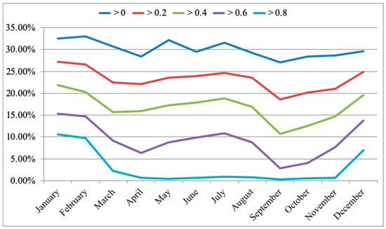 Figure 9 shows that the obtained energetic complementarity has the same pattern for the months of the year with different positive values, especially for values greater than 0.2, 0.4, and 0.6. For values higher than zero, the energetic complementarity oscillates around 30%, while for values greater than 0.8, only the months of January, February, March, and December have values above 2%. Bear in mind that greater obtained values mean more power generations using both resources, and in consequence, more possibilities to meet the power demand with no backup systems.