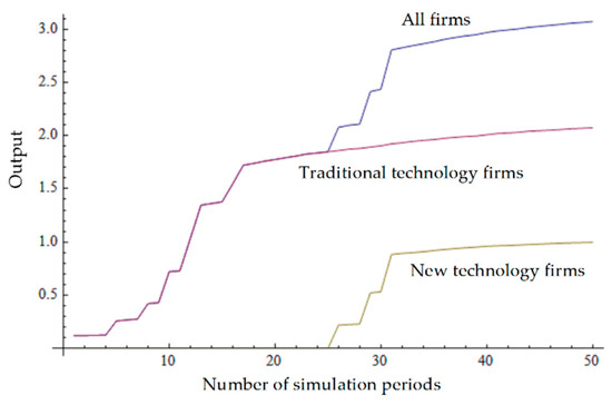 - The total output increased faster before the number of traditional firms reached the ceiling because the increasement of the total output is mainly caused by the entry of traditional technology firms.