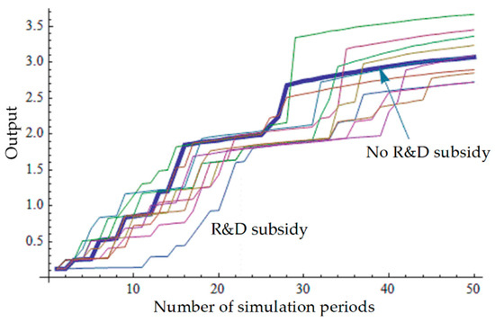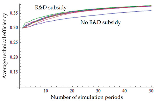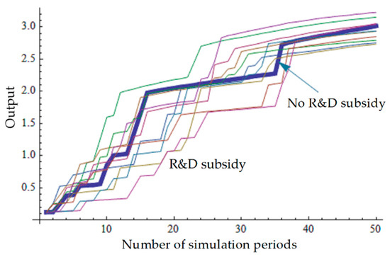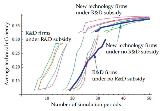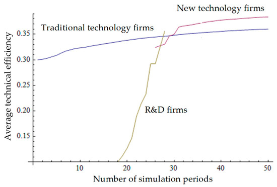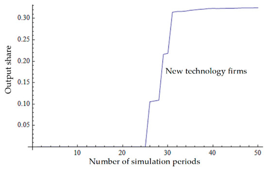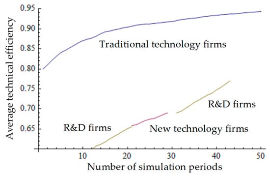 In this model, the entry of R&D firms is used to reflect the evolution characteristics of new technologies in the industry. There are two forms of entry for R&D firms: one type of firm is newly created by incumbent firms, and the other is a random start-up. The R&D output of these two kinds of R&D firms is mainly determined by the efficiency of technical output and the amount of R&D input. If the newly established R&D firms have the same total amount of R&D capital, , and take a fixed proportion of the R&D capital as the R&D investment in each period, the differences between the two kinds of newly established R&D firms include two elements. First, since newly established R&D firms are usually more flexible than incumbent firms, and the flexibility of the system is more conducive to the formation of new technologies, newly established firms will have higher R&D productivity than incumbent firms, which is mainly reflected in the difference between the two types of firms in terms of value [43]. Second, as mentioned above, new technology may replace old technology, which will lead to a sunk cost loss for the incumbent firm. Therefore, the incumbent firm will reduce the proportion of R&D investment, which is negatively correlated with the residual fixed assets of the original firm. Its R&D investment is