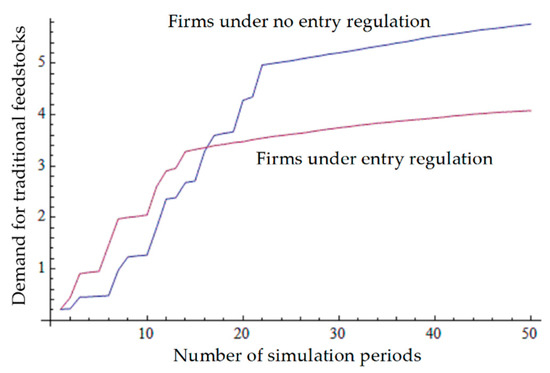 Production firms in the fuel ethanol industry are divided into two types: one is the traditional technology firm which mainly uses traditional production technology and the other is the new technology firm which mainly uses new production technology. Let denote the number of traditional technology firms entering in period t. According to the previous section, it is related to and , which indicate the cost to revenue ratio of traditional technology firms and the number of firms in the industry of the last period respectively, as well as the random distribution function . In addition, in the fuel ethanol industry, the entry of traditional technology firms is also restricted by the shortage of feedstocks. Then, we can describe the number of traditional technology firms as follows: