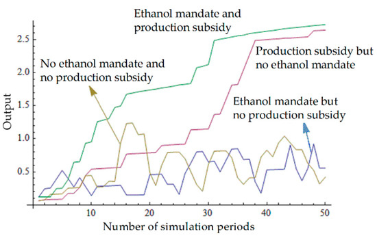 Other scholars analyzed the distortion effect of fuel ethanol policy from the perspective of international trade. If the U.S. government were to cancel tariff protection and reduce the scope of tax cuts, ethanol imports would increase 130%, while domestic ethanol production would fall 9% [11]. The current biofuel trade protection policy in the United States not only reduces the industrial competitive advantage of corn-based ethanol but also increases dynamic learning costs, which will also reduce the international competitiveness of the future cellulosic ethanol industry [38]. No matter how high the carbon tax rate is, a single carbon tax policy without additional subsidies will not promote the evolution of the fuel ethanol industry [19].