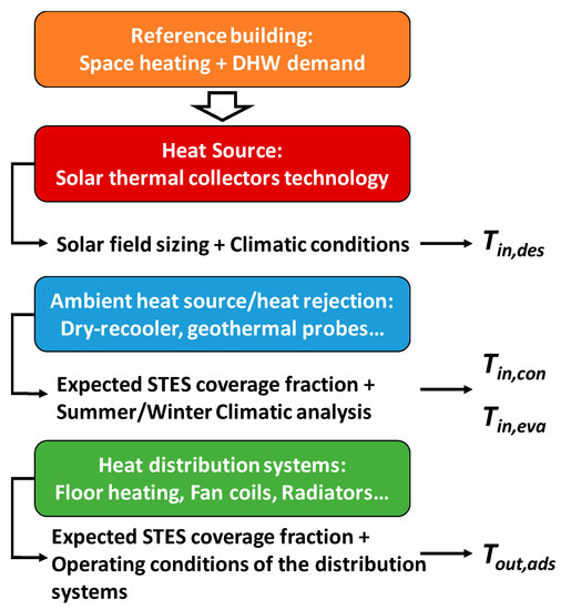 To identify the different temperature levels characterising the storage operation, as represented in Figure 2, once the reference building is defined along with the expected space heating and domestic hot water (DHW) demand, the following system characteristics must be defined: