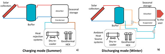 Figure 3 schematically represents the reference system considered in the present work, which is the one under development within the European Union (EU) project SWS-Heating. Basically, during the charging phase, solar collectors, connected to a thermal buffer, provide high temperature to the STES to promote the desorption. The heat of condensation is then rejected to the ambient, either through a dry re-cooler or to into the ground by means of geothermal HEX. During the discharging mode, the heat of evaporation can be provided by different sources: ambient heat, through the dry re-cooler, geothermal heat, through the geothermal HEX, solar heat, through the solar thermal collectors. The heat of adsorption is then provided to the distribution system.