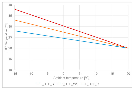 Supply, return and average heat transfer fluid (HTF) temperature as a function of ambient temperature for a reference case with Ta,N = −15 °C, TS,N = 38 °C and TR,N = 28 °C.