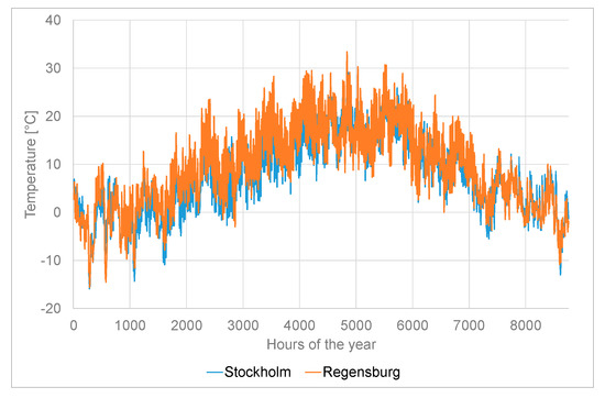 Hourly ambient temperature evolution for a reference year in Stockholm (Sweden) and Regensburg (Germany), evaluated from the Meteonorm 7.0 database.