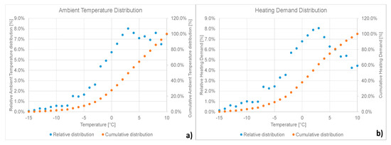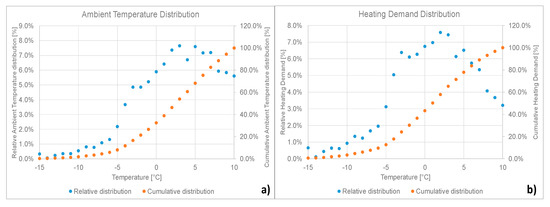 where nhours represents the number of hours during which the ambient temperature, Ta, is registered, while Troom represents the internal set-point, considered as 20 °C. Figure 6b and Figure 7b represent the relative and cumulative distribution for the heating demand calculated according to Equation (9) for Stockholm and Regensburg, respectively. As expected, the two trends were similar, even if, for the heating demand calculation, the relative weight of the low ambient temperature conditions was slightly enhanced. In both cases, the highest relative heating demand was concentrated in an ambient temperature range between 0 °C and 5 °C, even if, for Stockholm, relevant heating demand was also concentrated slightly below 0 °C.