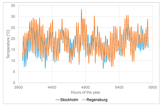 Ambient temperature evolution for the two hot summer months (second half of June, July, and August) for Stockholm and Regensburg.